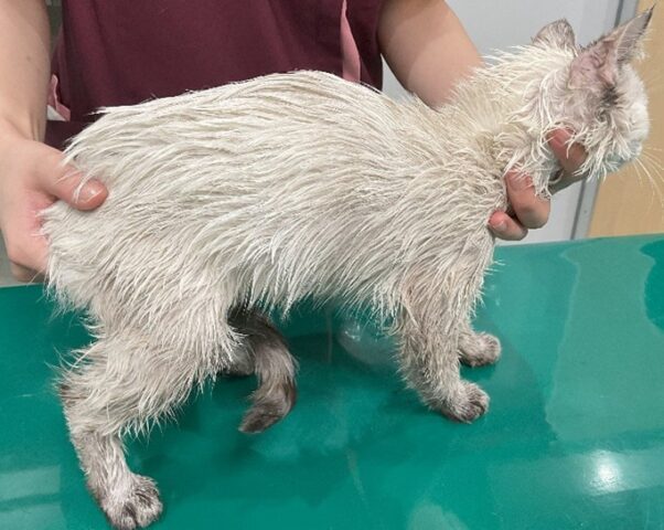 この子は病院で預かり食用洗剤で油を落とし、猫用のシャンプーを用いてきれいにしました。以下がその写真です。見違えました!